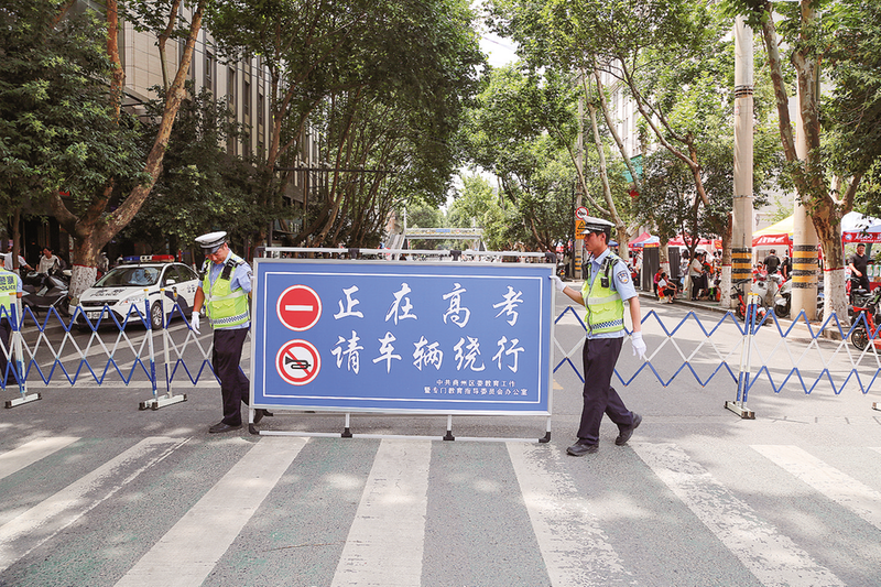 高考期间,商州交警严处考点周边车辆乱停乱放、乱鸣喇叭等行为,并对城区3个考点周边道路实施临时交通管制。