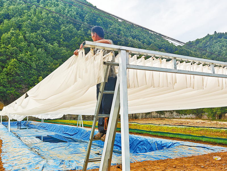 6月10日,施工人员正在水漾·向阳而生稻虾共生休闲露营地安装风动纱幔。据了解,该基地位于商州区三岔河镇,占地面积70亩,总投资500万元,规划建设稻田(麦田)观光区、帐篷露营休闲区、无动力游乐区、水上游乐区、稻田戏水区和配套服务区六大区域。项目预计年产值200万元,可带动107户农户增收。