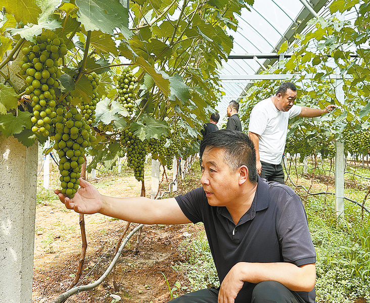 近日,丹凤县商镇黑沟河村葡萄产业园的葡萄长势喜人。该产业园主要种植品种为夏黑、巨峰、金手指、阳光玫瑰和巨玫瑰,2020年尝试引进并在坡地种植摩尔多瓦葡萄200多亩,带动周边群众近300人增收。 (本报记者 胡 蝶 摄)