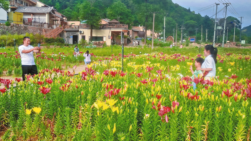 近日,丹凤县龙驹寨街道资峪沟村百合园内百合、油葵等竞相绽放,吸引周边市民群众前来赏花游玩。近年来,该村依托生态资源优势,坚持把三产融合作为乡村振兴的重要抓手,建成了集农文旅于一体的产业基地。(本报通讯员 樊利仁 摄)