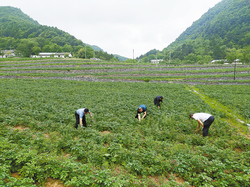 6月9日,商南县十里坪镇核桃坪村群众在马铃薯基地清除杂草。该村在商南农商银行驻村工作队的帮扶下,种植马铃薯600亩、莲花白80多亩、白萝卜20多亩。 (本报记者 南 玺 摄)
