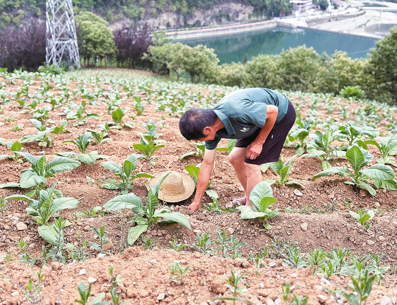 6月11日,在镇安县月河镇罗家营村的烤烟基地内,种植户正在给烤烟苗除草。据悉,该村通过实施“党建+产业链党小组+党员+农户”的烤烟产业发展模式,辐射带动益兴村、太自庙村、先进村等周边村发展烤烟3000亩,实现年产值930余万元,户均年增收7.2万元。 (本报记者 方 方 摄)