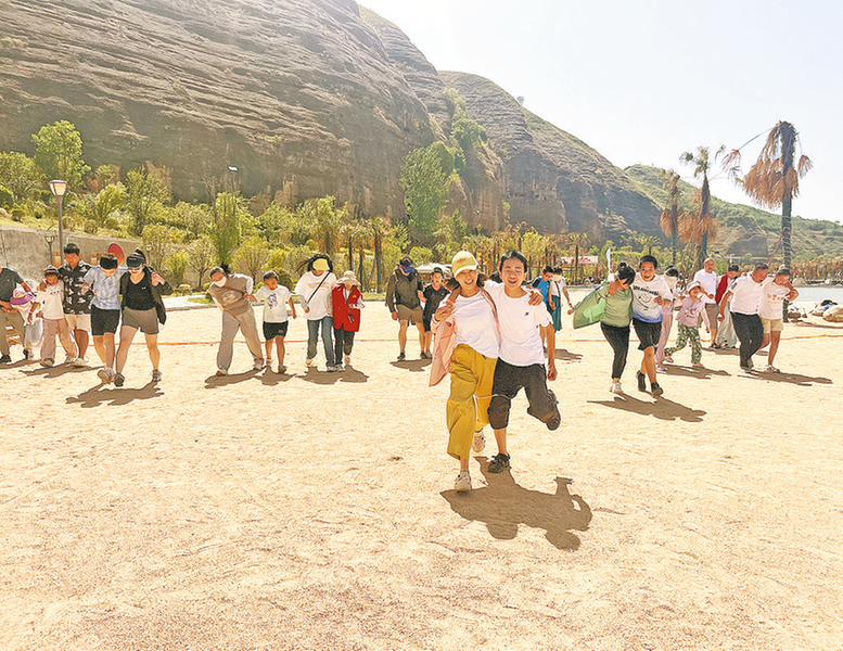 “我数一的时候,先迈绑住的脚,数二的时候再迈另一只……”在亲子游戏两人三足环节,家长和孩子用绑带将相邻的腿系在一起,在沙滩上并肩冲刺。现场气氛既紧张又欢乐,有的家庭配合默契,健步如飞,快速到达终点;有的虽然跌跌撞撞,却依然坚持不懈。