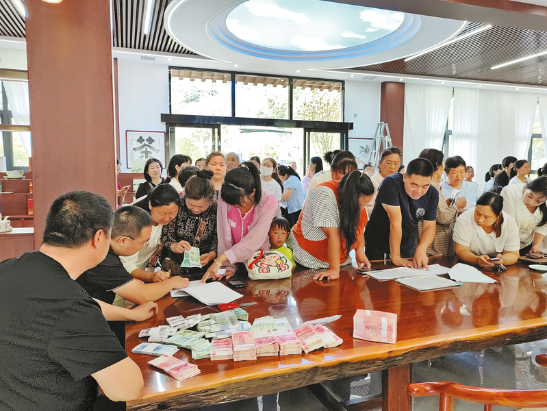 6月18日,位于商南县富水镇的商洛秦岭南坡茶业有限公司为茶农发放工资。据了解,该公司在富水镇油坊岭村建设1500亩标准化生态观光茶园,采用“公司+村集体经济+基地+农户”的利益联结机制,现已通过土地流转、务工等方式,带动富水镇油坊岭村125户310多人实现增收,户均年增收4000元以上。 (本报通讯员 杜金晖 摄)