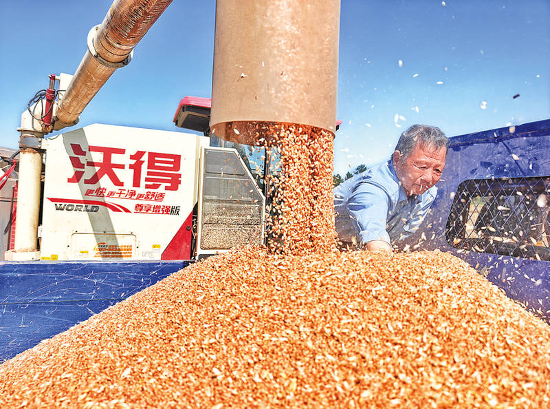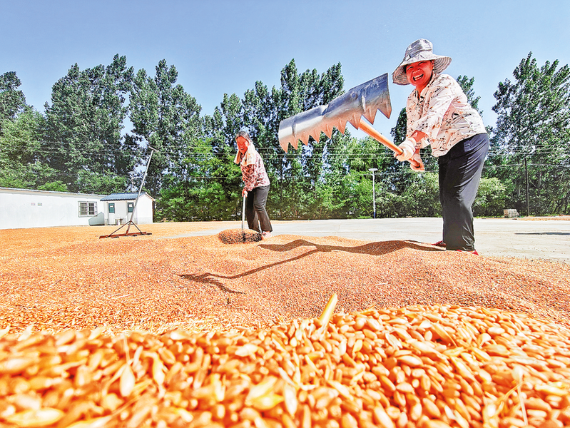 在何村雄风农机专业合作社院内,66岁的合作社成员张挡民开着三轮车运来刚刚收获的麦粒,附近村民王夏莲和陈麦娥匆匆用铁耙晾晒小麦颗粒,院边一台大容量小麦烘干机正“火力全开”进行烘干。