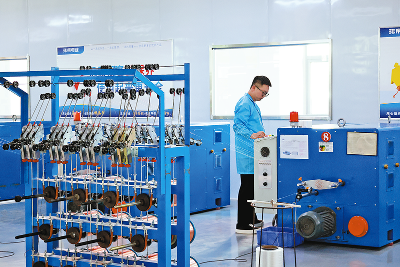 6月23日,在位于山阳高新区电子信息产业园的陕西玮帝电业科技有限公司生产车间内,工人正在生产线上作业。据了解,该公司主要生产电线、电缆、AC电源线,目前已建成电线、电缆、AC电源线生产线4条,可实现年产值3700万元,带动就业20多人。 (本报记者 肖 莲 摄)