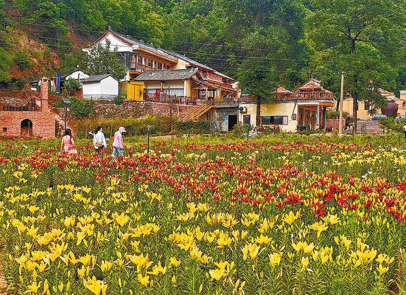 掩映在花海中的三里栈原乡民宿盛夏6月,漫步在丹凤县龙驹寨街道资峪沟村的青石板路上,古色古香的三里栈原乡民宿掩映在连片的百合花海中,在远处的秦岭山脉衬托中,显得更加宁静雅致。几名游客摆起了姿势,在花海中拍照。