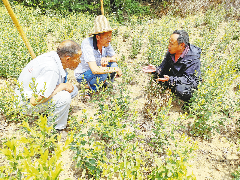 6月27日,商州区北宽坪镇农技干部来到宽坪社区中药材种植户的苍术地,查看苍术根部病变引起药苗坏死情况,指导种植户用啤酒加阿司匹林按比例混合后灌根防止苍术根部病变,方法简便易学,操作性强,受到了中药材种植户好评。 (本报记者 王孝竹 摄)
