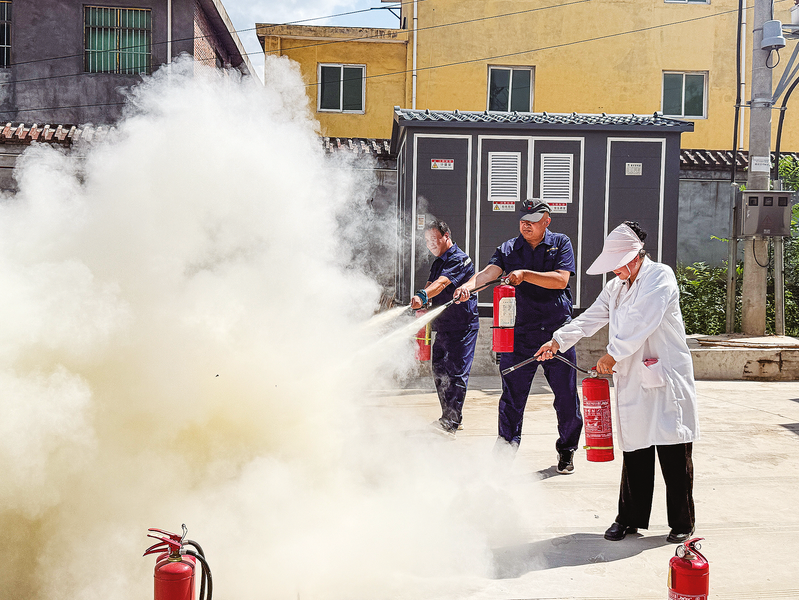 7月4日,商州区粮业有限责任公司、商州区中心粮站、商州区鹤州粮食和物资储备有限责任公司、商州区郎缘香食品科技有限责任公司,联合商州区消防救援大队,开展消防综合应急演练,通过理论与实操结合的方式,全面检验应急处置水平。 (本报记者 王孝竹 摄)