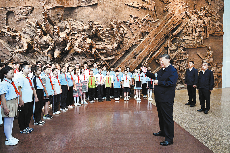 7月7日至8日,中共中央总书记、国家主席、中央军委主席习近平在山西考察。这是7日下午,习近平在位于阳泉市狮脑山的百团大战纪念馆考察时,同前来参观的青少年学生和纪念馆工作人员亲切交流。 (新华社记者 谢环驰 摄)