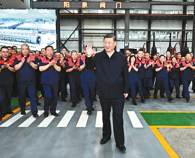 7月7日至8日,中共中央总书记、国家主席、中央军委主席习近平在山西考察。这是7日下午,习近平在阳泉阀门股份有限公司考察时,同企业员工在一起。 (新华社记者 燕 雁 摄)新华社太原7月8日电 中共中央总书记、国家主席、中央军委主席习近平近日在山西考察时强调,山西要认真落实党中央关于促进中部地区加快崛起、推动黄河流域生态保护和高质量发展等战略部署,坚持稳中求进工作总基调,完整准确全面贯彻新发展理念,统筹好发展和安全,努力在推动资源型经济转型发展上迈出新步伐,奋力谱写三晋大地推进中国式现代化新篇章。