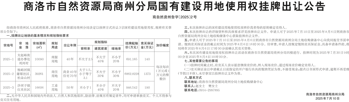 商洛市自然资源局商州分局国有建设用地使用权挂牌出让公告