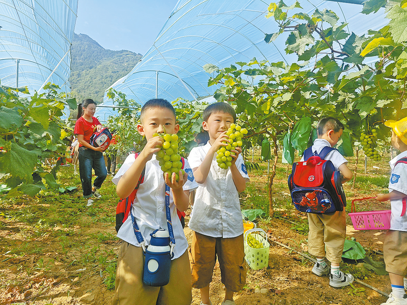研学活动中,孩子们体验葡萄采摘的乐趣。万亩葡园织锦绣,一颗葡萄富一方。盛夏时节,丹凤县商镇黑沟河村的葡萄架下,果农叶家满正忙着精心照料颗粒饱满的“夏黑”葡萄。“今年葡萄长势特别好,预计再过不久就能上市了!”他擦着汗笑道,指尖的葡萄串在阳光下泛着玛瑙般的光泽。通过深入走访,笔者深切感受到:在商镇,葡萄早已不是传统意义上的特色水果,更成为串起乡村振兴的“甜蜜链”。