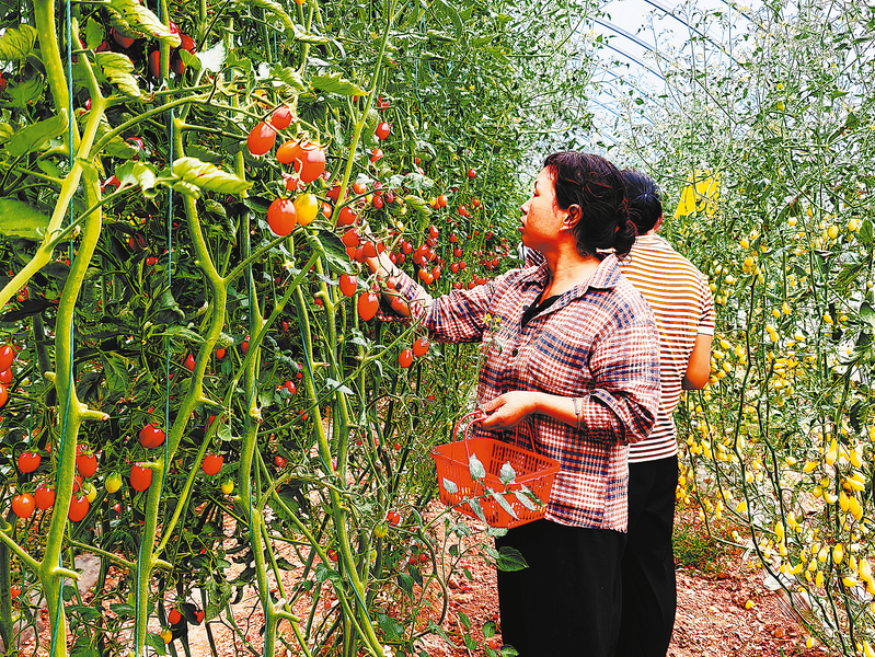 7月10日,在洛南县宁农瓜果蔬菜产业园内,群众正在采摘新鲜圣女果。据悉,该产业园占地600亩,建有420个大棚,分3个基地,涵盖了古城镇的高塬村、中联村、四联村,主要种植越夏硬粉西红柿,年产量达4000吨,年产值超1200万元,带动周边300余名群众就业增收。 (本报记者 方 方 摄)