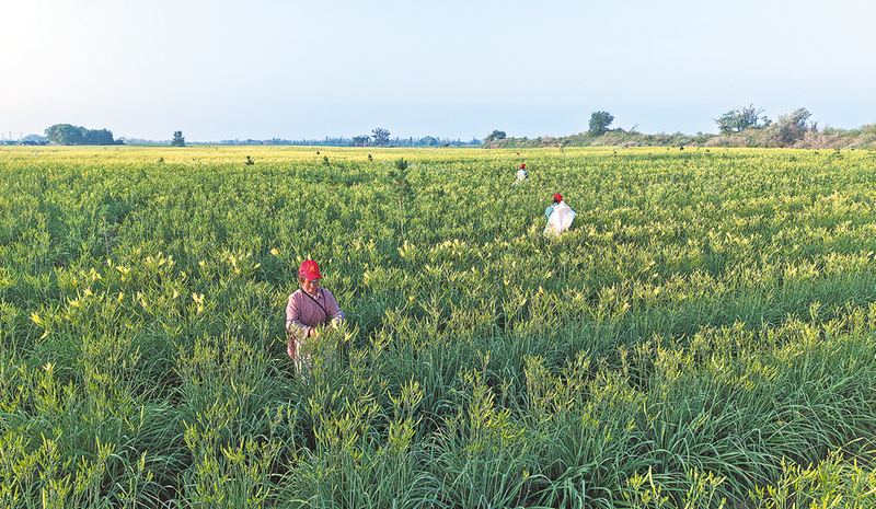 7月13日,镇安工人在榆林采摘黄花。据悉,今年镇安县同舟济人力资源公司向陕北输送采摘黄花农民工120多人,人均月增收6000元以上。 (本报通讯员 杨建东 摄)