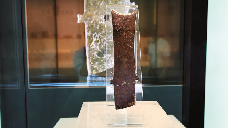 秦岭博物馆建筑造型灵感来源于国宝级文物“夏代玉牙璋”,器身分为射、身、柄、扉牙四部分,扉牙造型接近龙首侧面。这件墨玉材质礼器的发现,填补了陕西夏代玉器考古的空白,被视为穿越千年的文明信物。