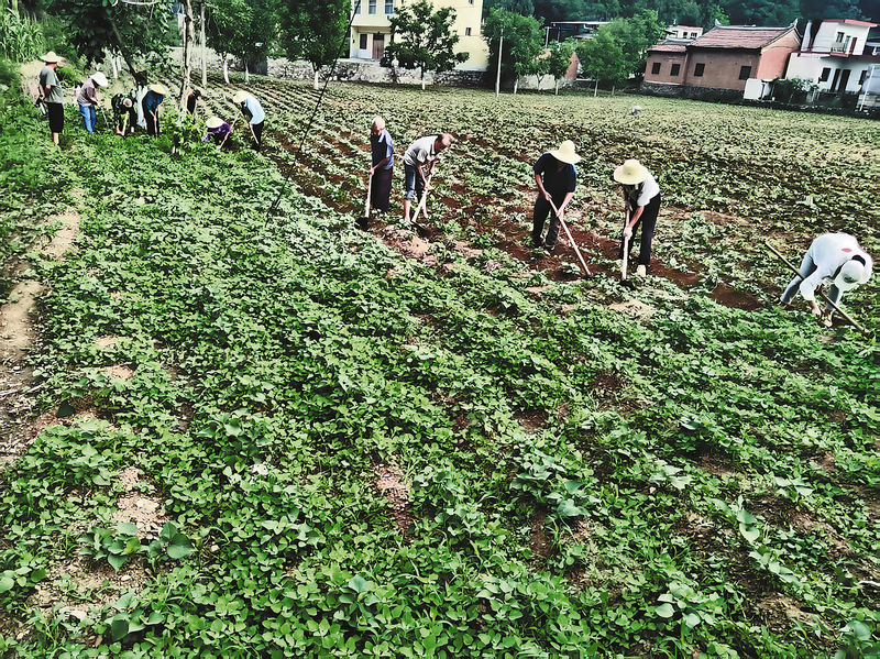 近年来,丹凤县铁峪铺镇桃花村大力发展村集体经济,推动乡村振兴落地见效,增加群众收入。据悉,今年该村集体经济种植“秦薯5号”红薯40亩,预计产量8万公斤,带动村集体经济增收约10万元。图为该村群众在红薯地间除草翻秧。 (本报通讯员 田 东 摄)