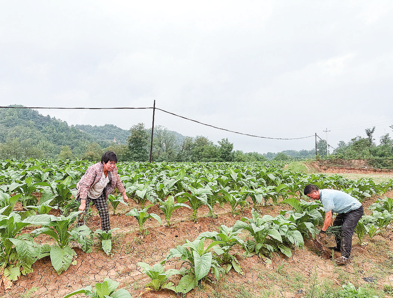 多年来,洛南县永丰镇持续发展烤烟种植,全镇烤烟种植面积目前近1万亩,年产值超5000万元,成为农民增收、乡村振兴的关键产业。图为7月8日,村民在对烟苗进行科管,提升烤烟品质。(本报记者 谢 非 摄)