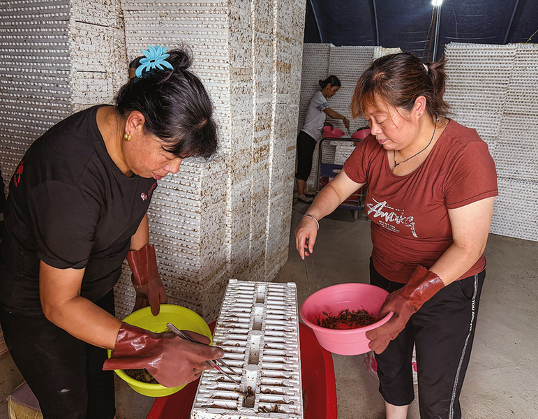 7月16日,村民在商洛迈源农业科技有限公司的全蝎养殖基地清蝎,每天可清100多公斤全蝎。该养殖基地位于商州区夜村镇白杨店村,自2021年以来,吸纳周边村民在养殖基地务工增收,大力发展养蝎产业。 (本报记者 王孝竹 摄)
