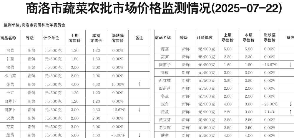 商洛市蔬菜农批市场价格监测情况(2025-07-22)