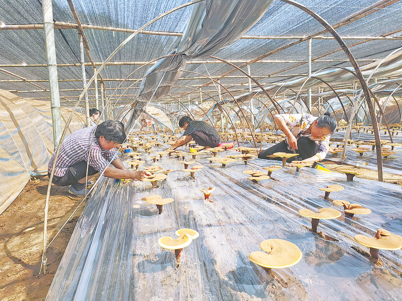 “覆膜看似简单,却也是细致活,考验着眼力和手力。薄膜孔要大小适中,刚好套到灵芝根部,仅有的一点缝隙要再用胶带粘紧,这样才能确保孢子粉完全着落在上面。”今年54岁的青山社区居民李金荣边干活边说,“这里离家近,我从春天开始搭建大棚、种植菌棒的时候就在这里干活,能持续到10月份,每天挣100元左右,再加上土地流转的钱,一家老小的生活费就不愁啦!”