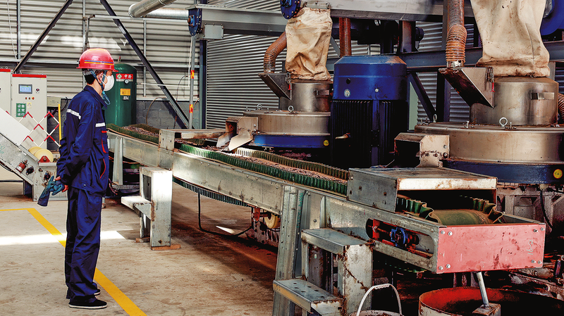 7月22日,在陕西鑫绿辉鸿生物科技有限公司加工车间内,工人正将废弃的木材边料等原料加工成生物质颗粒燃料。据了解,该项目总投资额6200万元,以农林废弃物、建筑用木质废弃物为原料,实现二氧化碳近似零排放,有效节能减排、保护生态。 (本报记者 杨 萌 摄)