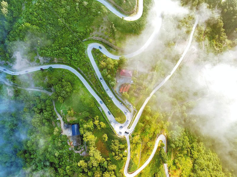 7月27日,镇安县永乐街道安山村盘山公路上车辆络绎不绝。安山村立足云海奇观,发展旅游经济,带动当地餐饮、住宿、交通等相关产业发展。 (本报通讯员 杨建东 摄)