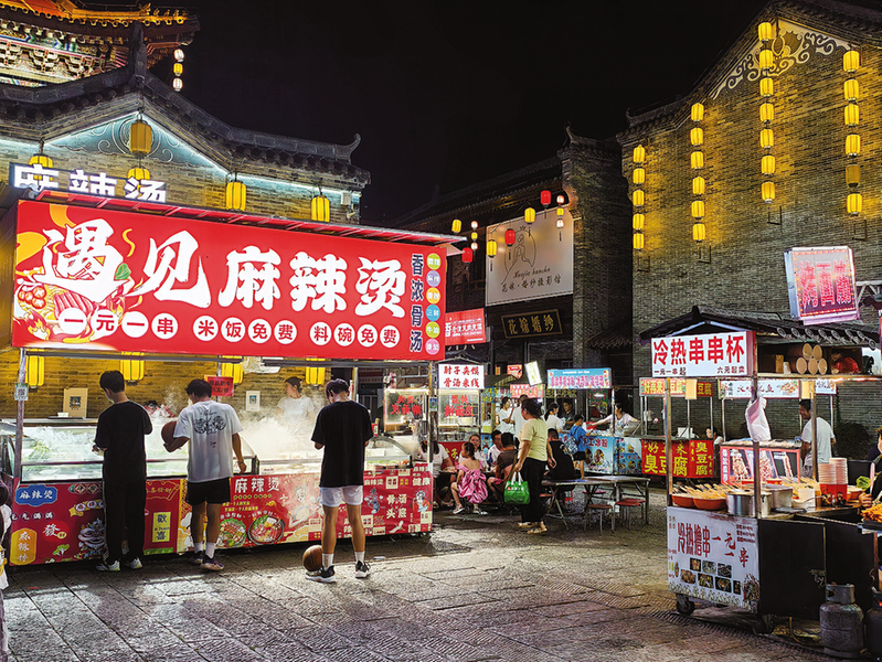 西街的热闹,不止在小吃摊前。安仁门广场前,孩童的街舞引得台下尖叫声雷动;汉服写真馆里,衣袂灯影交错让顾客目不暇接;走廊外侧,大学生小陈暑期支起彩绘摊,供游客体验文创之乐……这些流动的鲜活场景,是夜晚弥漫于西街烟火气里的新滋味。