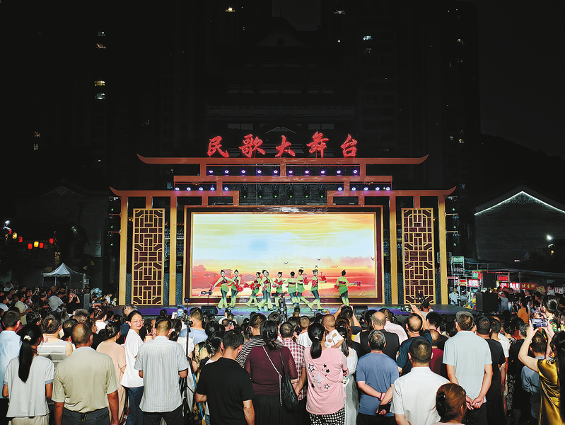 七月二十八日,二〇二五年“四季村歌”陕西省示范展示活动“商南民歌大家唱”活动在商南县古城西街商圣广场举行,由商南县文化馆、县剧团演员带来的《丹江号子·划船调》《花棍飞舞幸福多》等节目轮番上演,立体呈现了商南民歌非遗文化的独特魅力,为现场观众带来了一场视听盛宴。 (本报通讯员 李行摄)