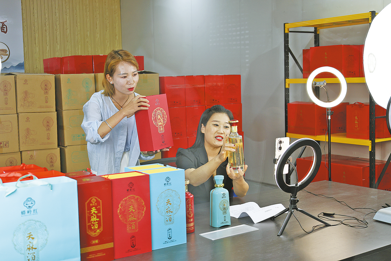 7月25日,在丹凤县峦庄天麻三产融合示范园的天麻产品直播间,主播正在向观众介绍天麻酒。据了解,该产业园集天麻种植、精深加工、商贸物流、康养旅居于一体,目前已建成年产2000万袋天麻“两菌”生产线和年产500吨天麻蜜片、天麻预制菜、天麻挂面生产线,研制出天麻冻干粉、天麻酒等15种食药同源产品。同时,通过“园区+村集体经济+农户”模式,辐射带动当地及周边1.2万户群众发展天麻种植1400万平方米,户均增收5万元。 (本报记者 肖 莲 摄)