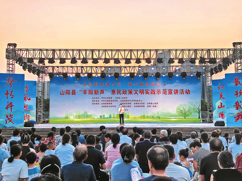 七月三十日晚,山阳县人民广场灯火辉煌、人潮涌动,两千多名干部群众欢聚一堂,共同见证了一场别开生面的“丰阳新声”惠民政策文明实践示范宣讲活动。据了解,此次活动将在十八个镇(街道)举办七场示范宣讲以及二百三十九场集中宣讲。(本报记者张英 摄)