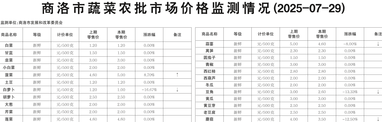 商洛市蔬菜农批市场价格监测情况(2025-07-29)