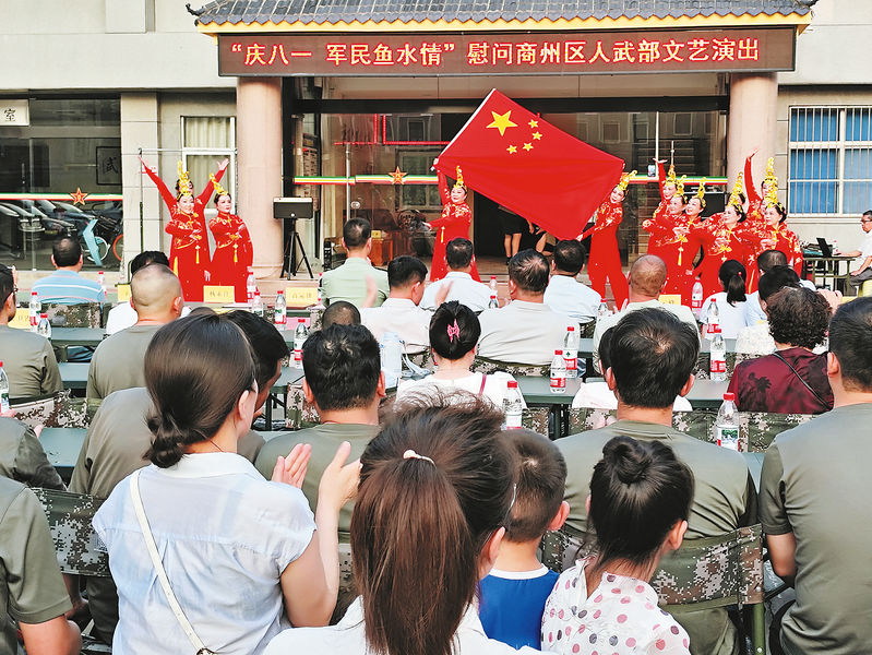 7月31日,由商洛开放大学、商州区人武部主办,商洛乐友联谊会乐友艺术团承办的“庆八一·军民鱼水情”慰问演出在区人武部举行,军歌联奏、红歌联唱、舞蹈、独唱等12个文艺节目,轮番上演,部队官兵和群众200多人观看了演出,活跃了军营文化生活。 (本报记者 贾书章 摄)