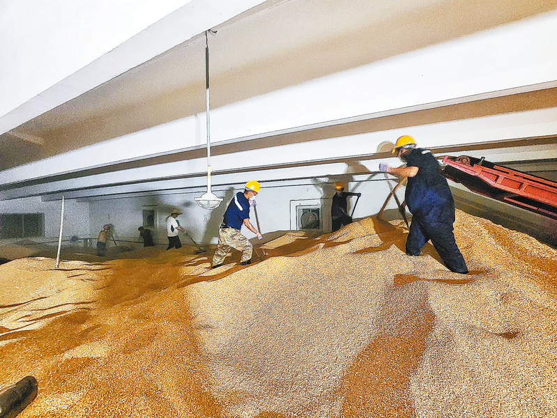 商州区扎实推进储备粮轮换工作,截至7月底,已完成2025年度市区级储备粮轮换任务的60%。图为7月31日,工作人员正在粮库作业。 (本报记者 杨 鑫 摄)