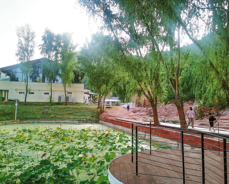 在商州区张峪沟东坡院子康养度假农庄则是另外一番悠闲景象。沿着蜿蜒的青石板路缓步前行,黛瓦白墙的民宿小院错落有致,开放式阳台上,游客或赏丹霞地貌,或沏茶小憩。荷塘里,荷花正竞相绽放,粉白相映,碧叶连天,为夏日增添了一抹清新的色彩,吸引不少游客前来观赏、拍照。