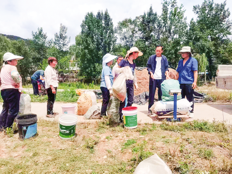 8月8日,洛南县灵口镇焦村的村民正在将装好的豆角上秤称重。据了解,焦村的无架豆角是种植在光伏板下的经济作物,预计今年为村集体增收10万多元。 (本报通讯员 王飞龙 摄)