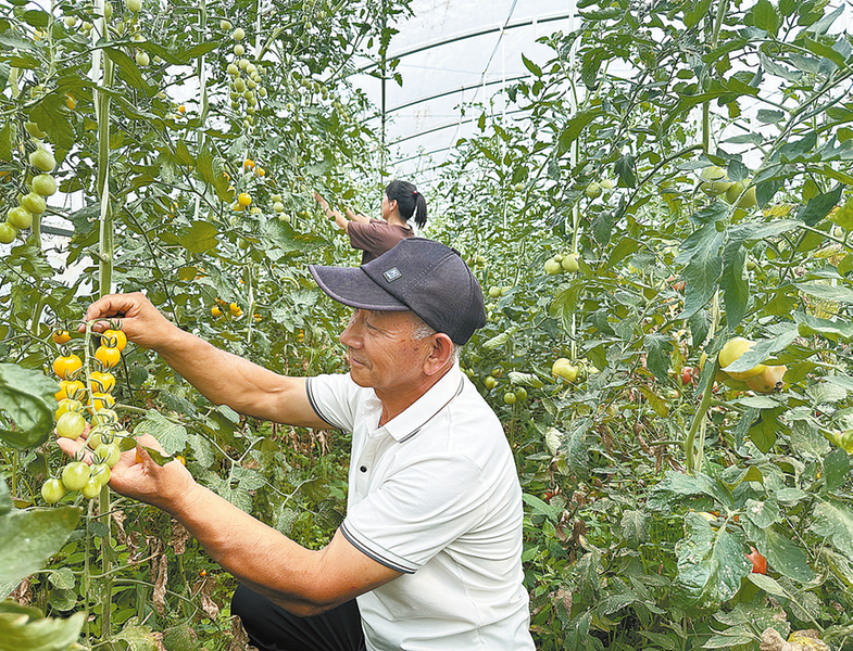 8月7日,在商山农夫蔬菜专业合作社大棚里,村民正在采摘蔬菜。商山农夫蔬菜专业合作社位于商州区大赵峪街道桃园村,因所处位置海拔高,适宜发展高山蔬菜种植,目前投资250万元,建育苗大棚6个。合作社采用“合作社+基地+农户”的模式,免费发放菜苗给周边群众,带动213户群众种植辣椒、西红柿等高山蔬菜,年产值100多万元。(本报记者 胡 蝶 摄)
