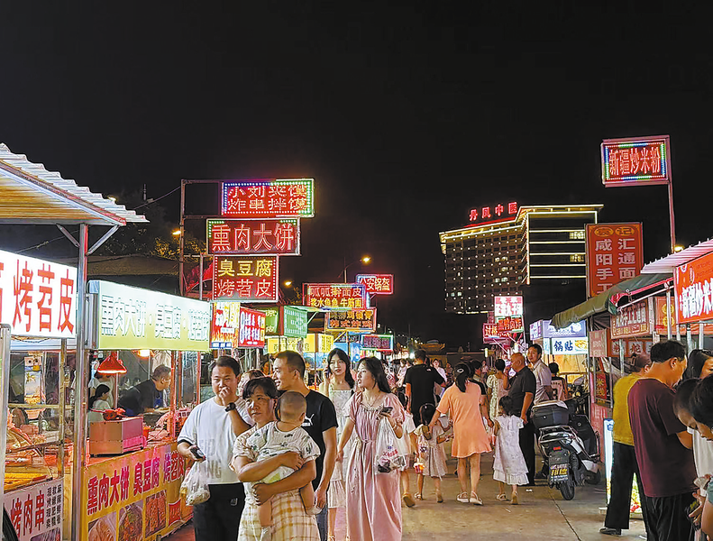 丹凤夜市里人气高消费旺8月7日傍晚,华灯初上,丹江水面倒映着两岸璀璨的灯火。在丹凤县江滨北路,一场关于味觉与温情的夜间盛宴正徐徐拉开帷幕。霓虹灯下,100多个摊位整齐排列,摊主的吆喝声与食客的谈笑声交织,铁板上滋滋作响的炒粉、蒸笼里升腾的热气、冰饮杯壁凝结的水珠,共同勾勒出一幅生动的“夜经济”画卷。