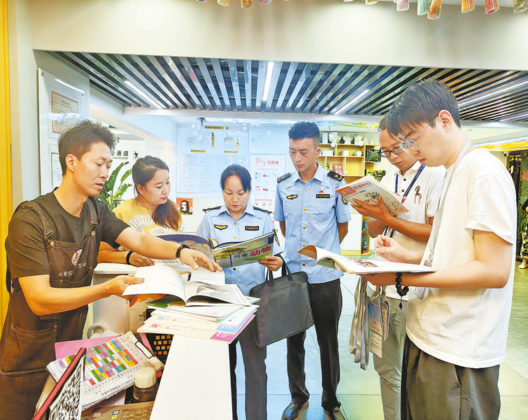 8月12日,洛南县委宣传部联合县文旅局、县市场监管局,深入城区艺术培训机构、书店和印刷企业开展校园周边文化市场执法检查。今年以来,洛南县深入开展“护苗2025”专项行动,综合运用技术审核过滤、多部门联合常态化市场检查等监管手段,重拳整治涉青少年儿童文化乱象,进一步筑牢未成年人安全屏障。 (本报通讯员 毕波波 摄)