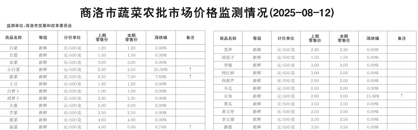 商洛市蔬菜农批市场价格监测情况(2025-08-12)