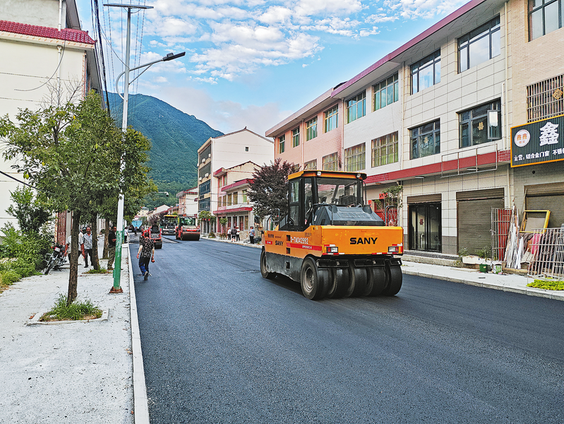 今年以来,镇安县茅坪回族镇多方筹措资金,实施“和美镇区”建设项目,不断优化人居环境,提升集镇品位,回汉群众的幸福感、获得感显著提升。图为8月15日,施工人员对该镇主干道进行“白改黑”改造。 (本报通讯员 张 昭 摄)