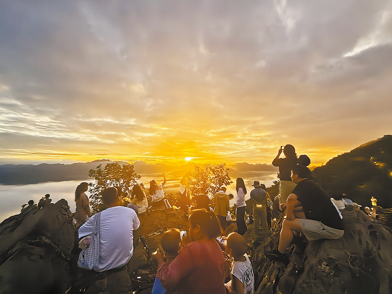 8月17日,游客在镇安县永乐街道安山村海棠山观看日出。据了解,海棠山因独特地理环境和便捷交通条件,吸引众多游客来此看云海和日出,每逢周末,山上的民宿一铺难求。 (本报通讯员 杨建东 摄)