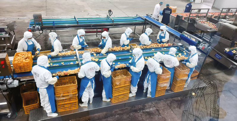 洛南县种植核桃历史悠久,先后获得“中国核桃之乡”、全国“十大金牌核桃县”等美誉。近年来,洛南县依托优越的生态区位、丰富的自然资源,建成了西北核桃物流园,并成功引进陕西忠果集团、天榛食品科技公司等7家生态农特产品系列加工企业,打造出全国首家以核桃单品大宗交易为主的线上线下交易平台,形成了“买全国、卖全国”的市场格局。图为8月11日天榛食品科技公司生产线上工人加工苹果干的场景。