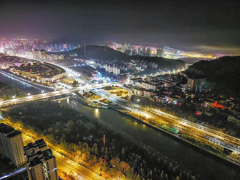 在一排排或黄或蓝或紫的灯带交替映射下,水面泛着亮光,平添了几分神秘。丹鹤楼通体发着金灿灿的亮光,更显宏伟,与王源大桥上橙红的亭子相呼相应。