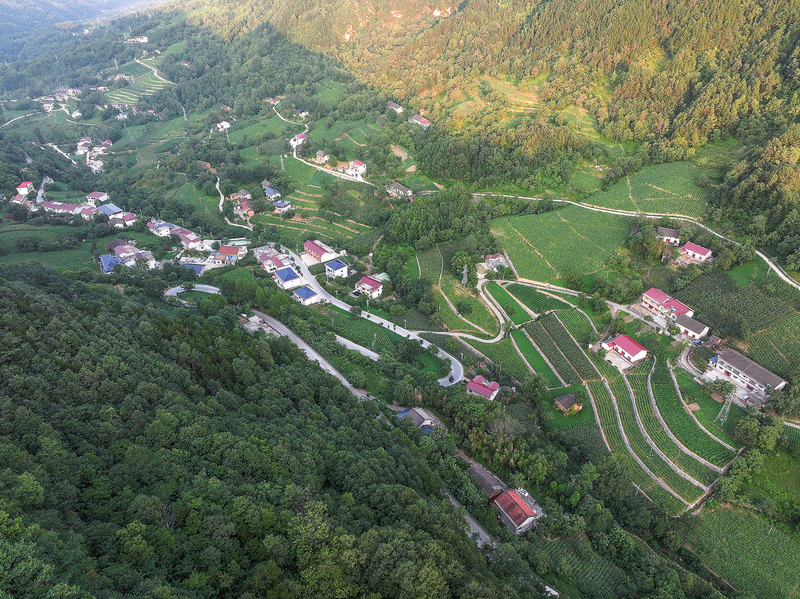 俯瞰联盟村,白墙黛瓦点缀在青山绿水间。