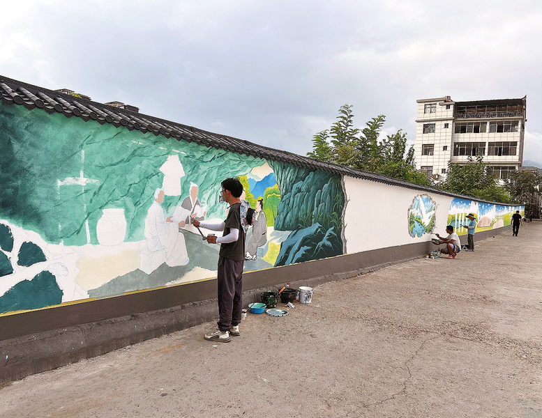 8月22日,商州夜市西北侧的巷道里,绘画人员正在描绘墙面。丰富多彩的墙绘,不仅美化了环境、提升了城市颜值,更增强了市民的文化自信。 (本报记者 黄朝梅 摄)