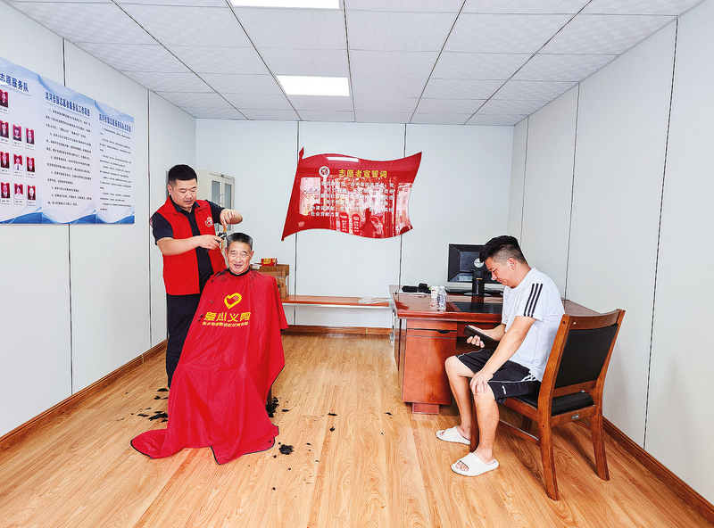8月19日,在镇安县永乐街道新城社区滨河佳园小区“志愿者之家”内,志愿者正在为小区老人进行爱心义剪。近年来,滨河佳园小区通过爱心义剪、爱心餐厅等措施不断提升小区居民幸福感。