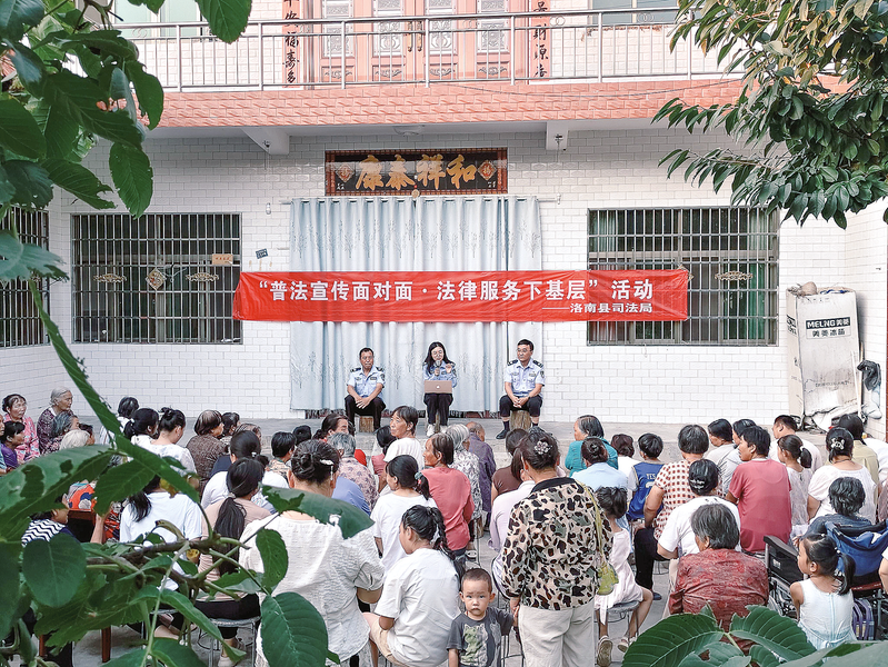 8月13日,洛南县司法局工作人员在保安镇黑潭村开展“零距离”普法宣讲,重点解读与群众、企业生产经营息息相关的法律法规,引导群众运用法律武器维护自己的合法权益,增强群众的法律意识。 (本报记者 杨 鑫 摄)
