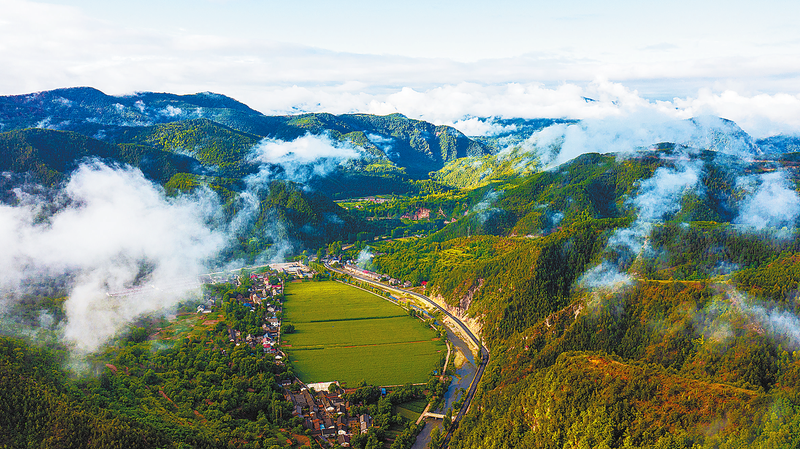 七八月份的商洛,天空湛蓝,田野翠绿,一片生机盎然的景象。