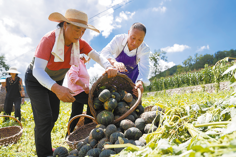 近日,洛南县寺耳镇伍仙村的贝贝南瓜成熟,田间地头洋溢着收获的喜悦。图为8月20日村民热火朝天地采摘南瓜的场景。 (本报通讯员 田 波 摄)